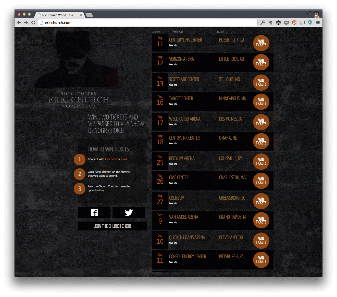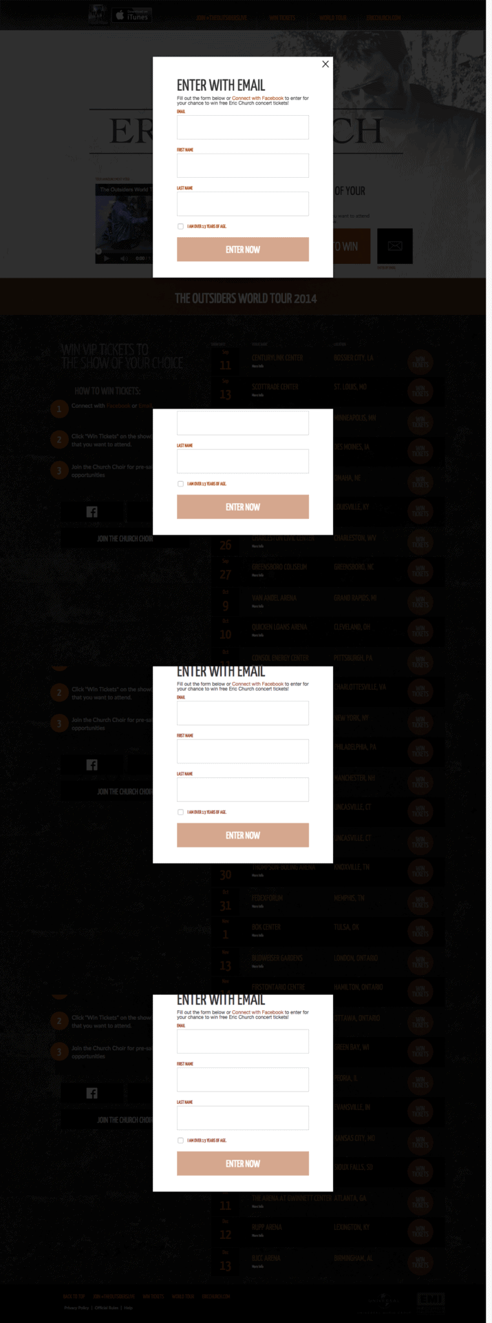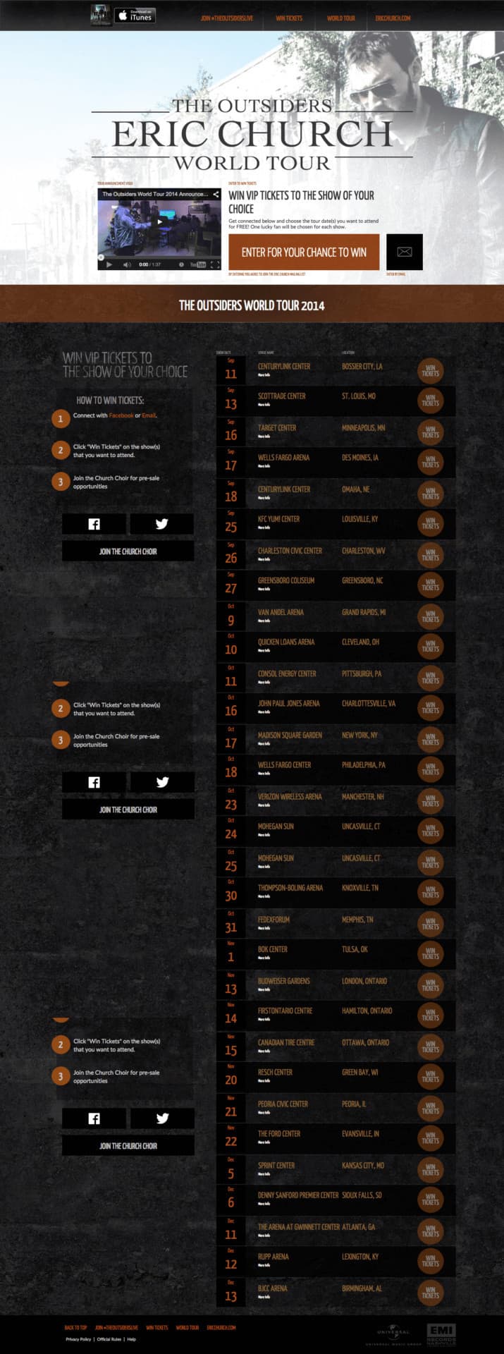 To promote ticket sales for The Outsiders World Tour, Universal Music Group created a tour page, including a sweepstakes component where fans could enter to win VIP tickets to a show of their choice.
