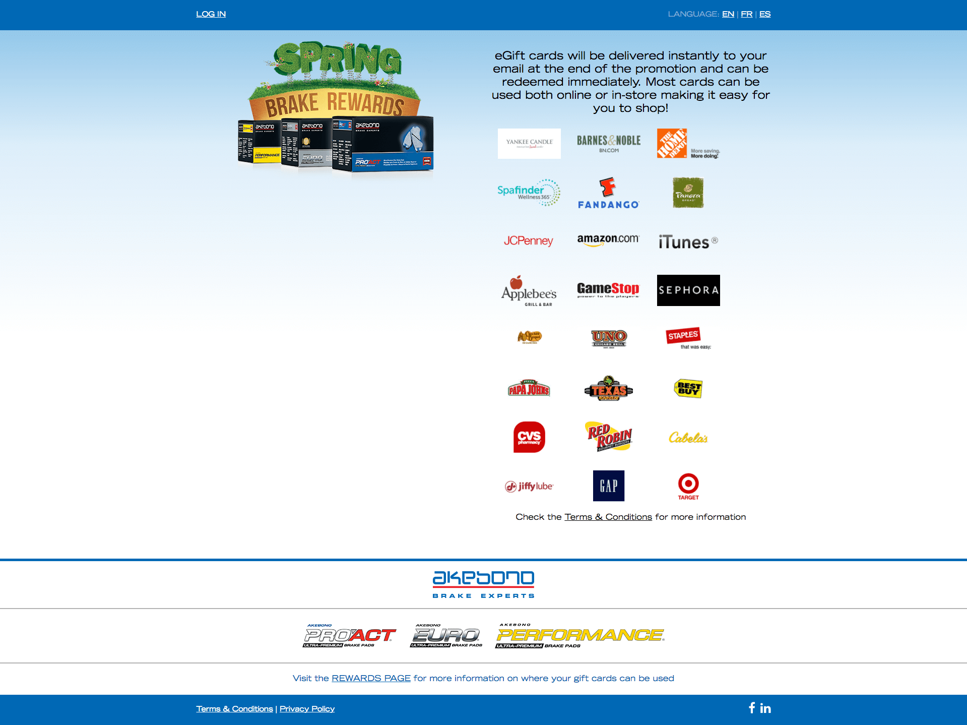Akebono launched a re-seller rebate program that targeted sales personnel across all retailers carrying Akebono brakes. Each individual sales person was rewarded on a monthly basis with AMEX gift cards based upon the quantity and SKU of brake packages sold.