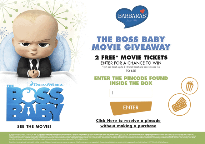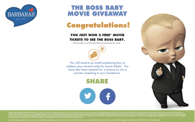 Barbara’s forged a partnership DreamWorks movie Boss Baby where consumers were offered an opportunity to win a private hometown screening of the film prior the theatrical release. The partnership was activated both online and retail via POS and product packaging.