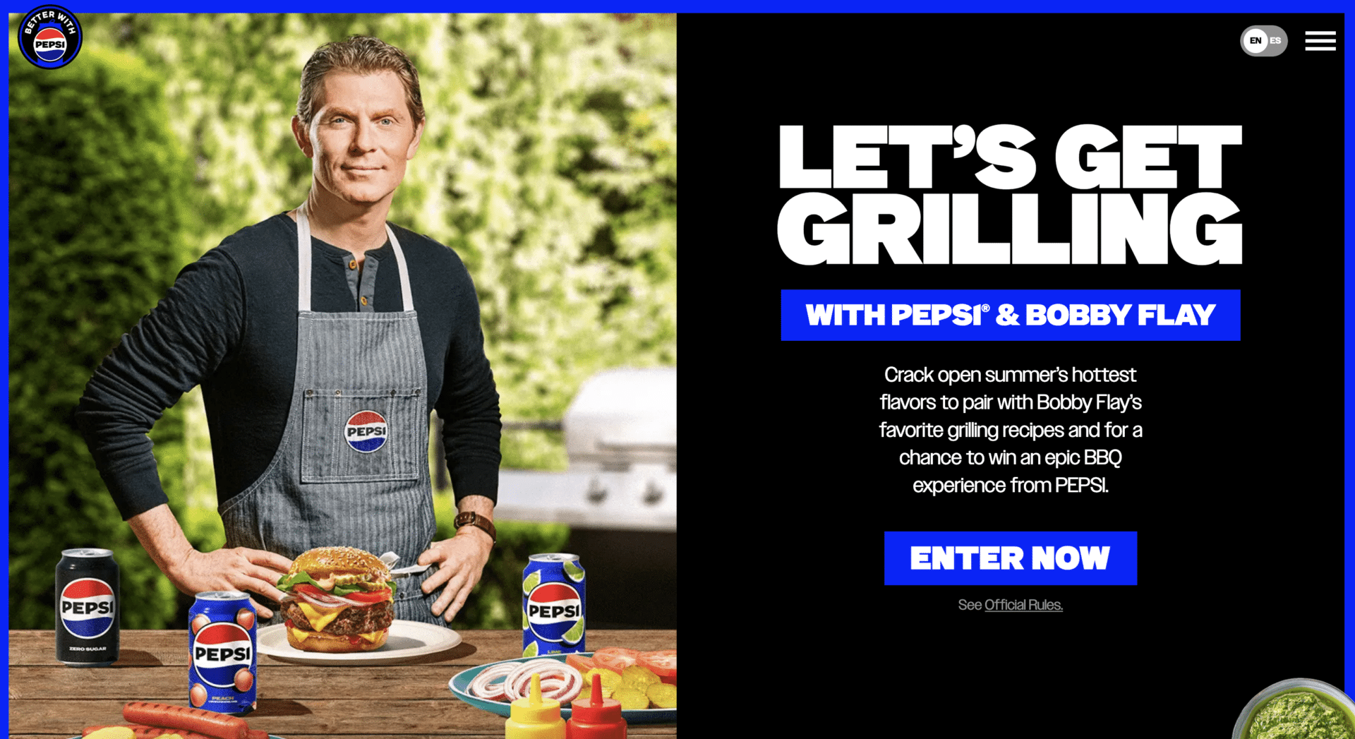 Renown celebrity chef Bobby Flay assisted Pepsi in crafting two distinct summer sodas – Pepsi Lime and Pepsi Peach. In promoting this historic summer collaboration, Pepsi + Bobby revealed a national promotion which enticed consumers to purchase and scan their Pepsi cans to win an epic barbecue experience.