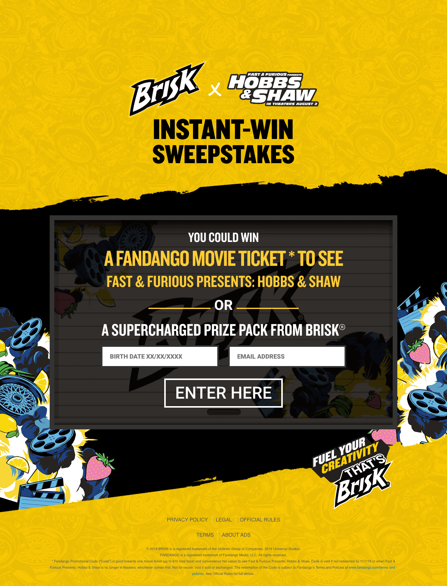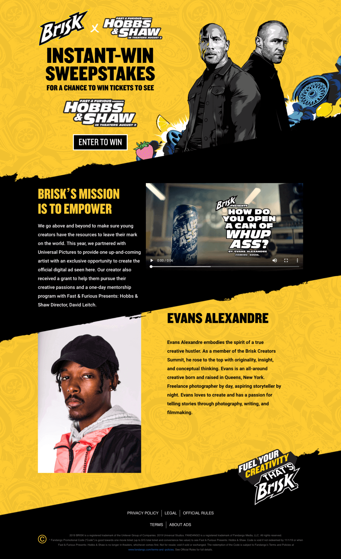 PepsiCo’s division Brisk, forged a collaboration with Universal Pictures’ Hobbs & Shaw to launch an instant win sweepstakes offering consumers daily opportunities to win Fandango codes to see the movie.