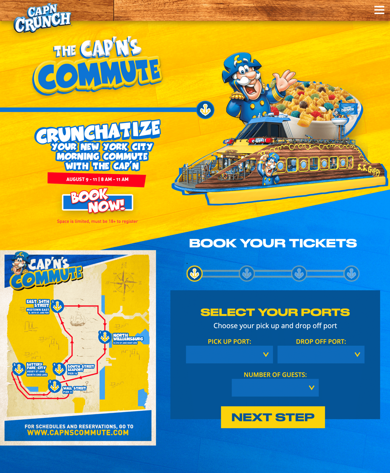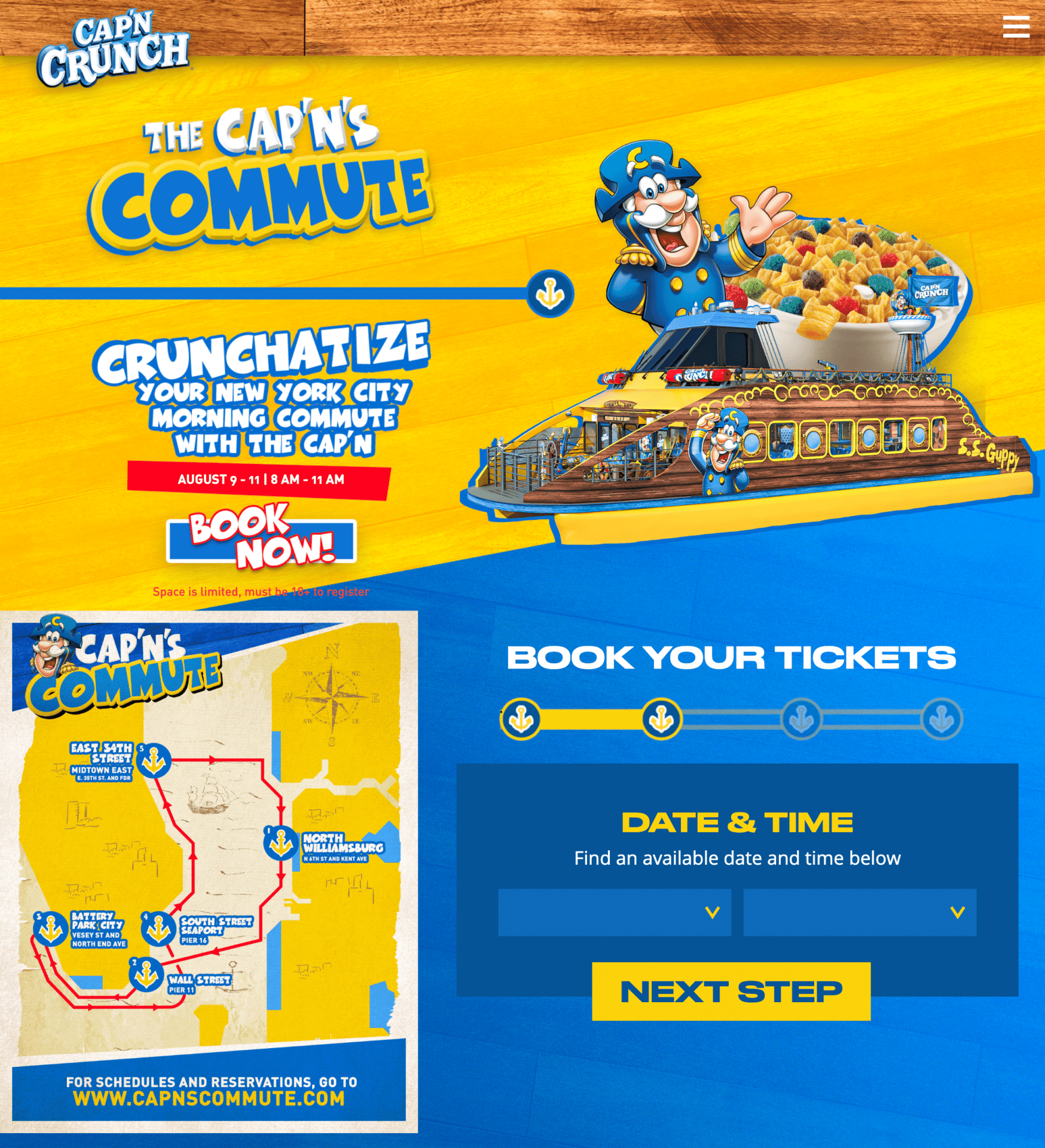 The Cap’N & crew commandeered and fully crunchitized a ferry in NYC to offer commuters a thrilling voyage. Passengers selected their departure + arrival ports and while onboard indulged in an array of Cap’N Crunch treats and themed experiences.