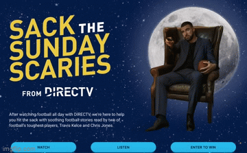 In collaboration with NFL Stars Travis Kelce and Chris Jones, DirecTV launched a digital experience to support footballs fans in their efforts to slumber following a long Sunday of game watching and adrenaline. Fans could listen or watch bedtime stories as well as enter to win sleep aids such as a Kelce body pillow or Pajersey.