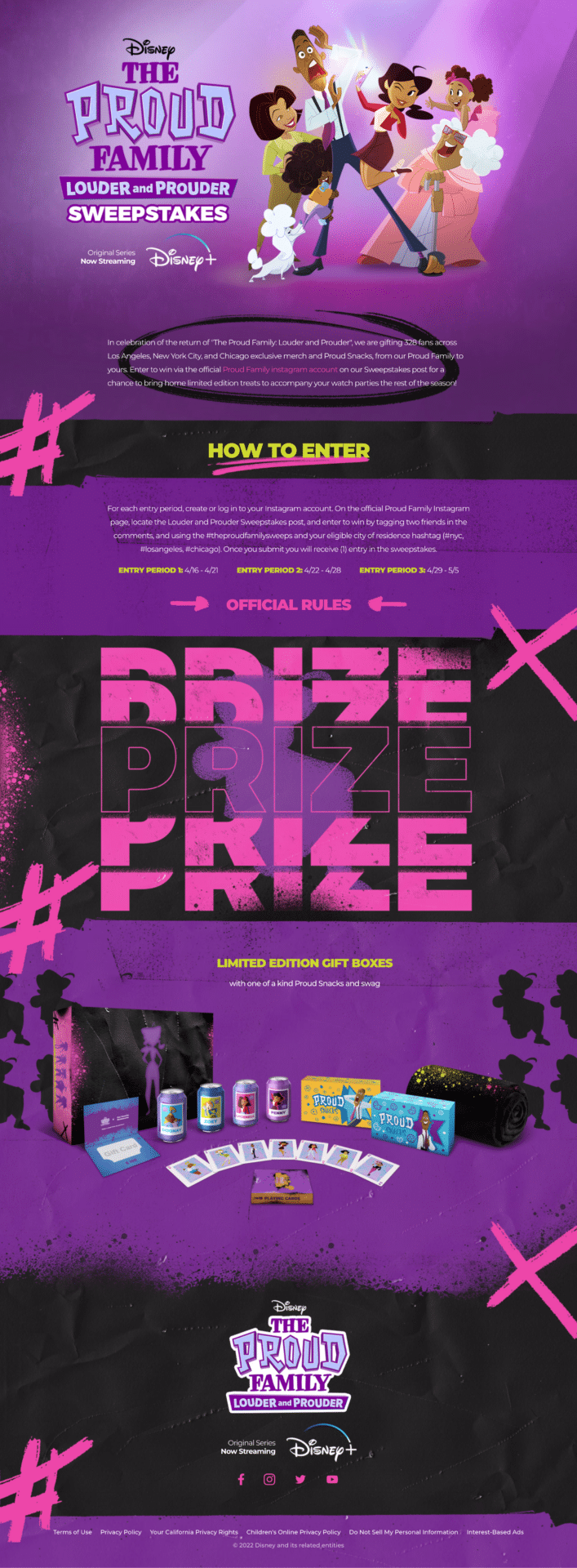In an effort to activate fans surrounding the return of the Proud Family, Disney initiated a series of sweepstakes in key markets offering consumers an opportunity to win a custom Proud Family gift box including gift cards to minority owned restaurants.