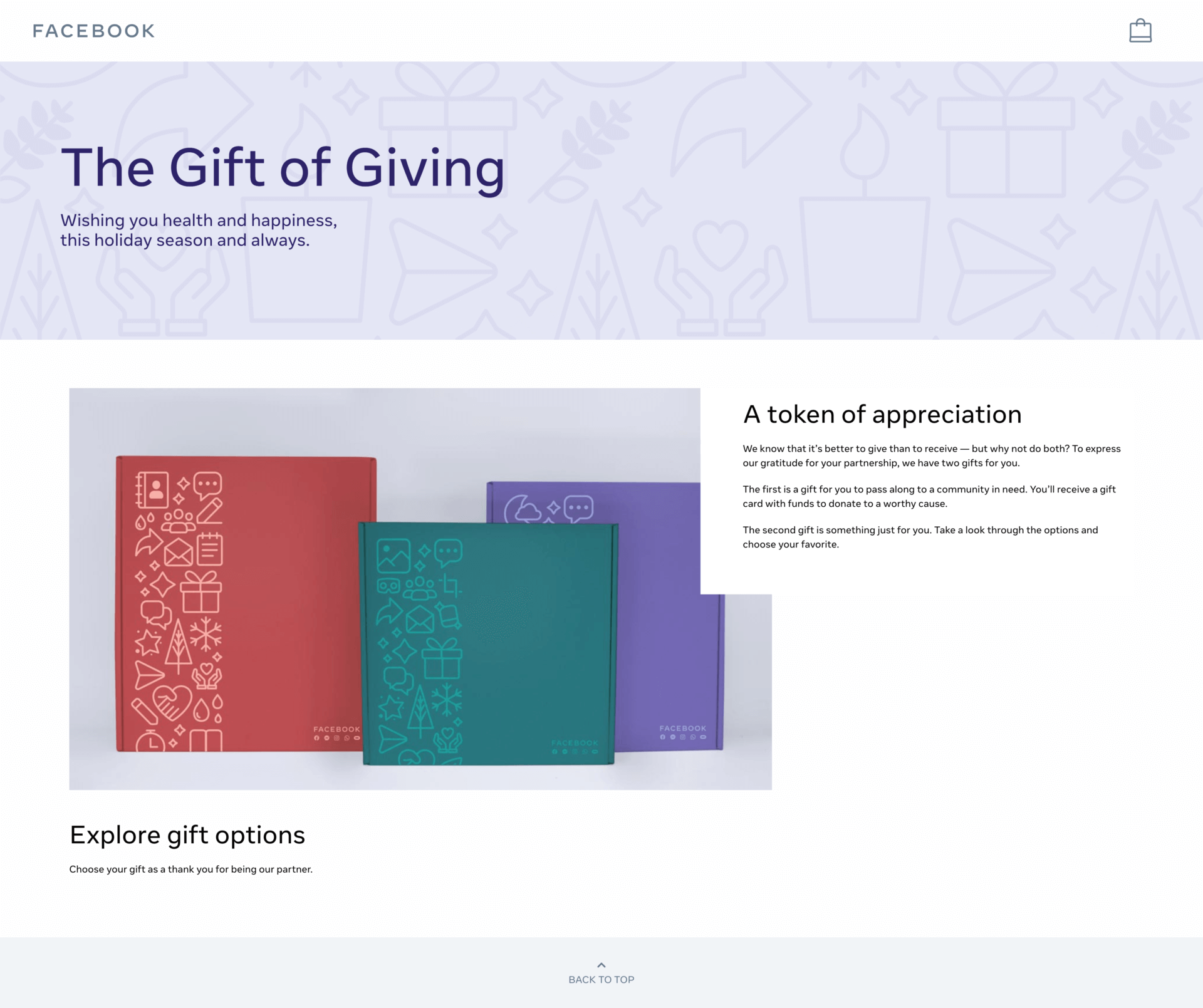 Facebook commissioned the development of a highly secure digital destination to support the organization’s efforts to provide a holiday gift to key small business partners.  Invited participants selected from a variety of gift options which were then delivered. The platform validated users, tracked gift inventory and provided orders in real time to fulfillment partner.