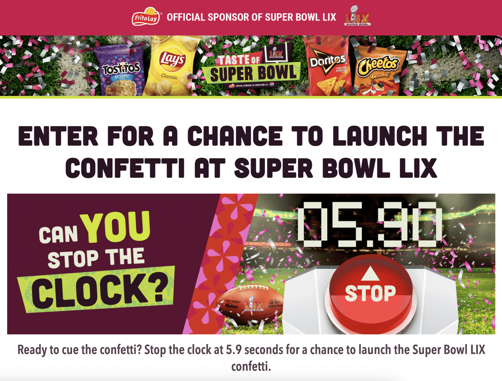 In anticipation of the Super Bowl, Frito-Lay launched a sweepstakes enabling fans to test their reaction time and attempt to stop a countdown clock at exactly 5.9 seconds. The winner earns the privilege of attending the game and pushing the confetti launch button at the end of the game to celebrate the victorious team.