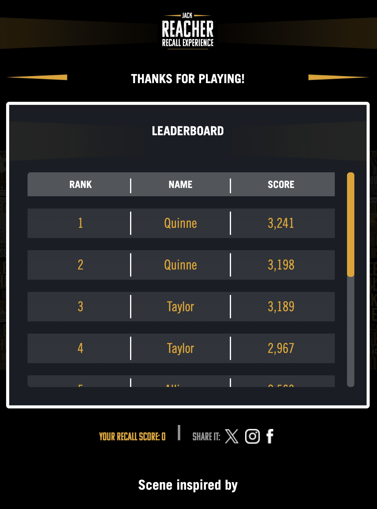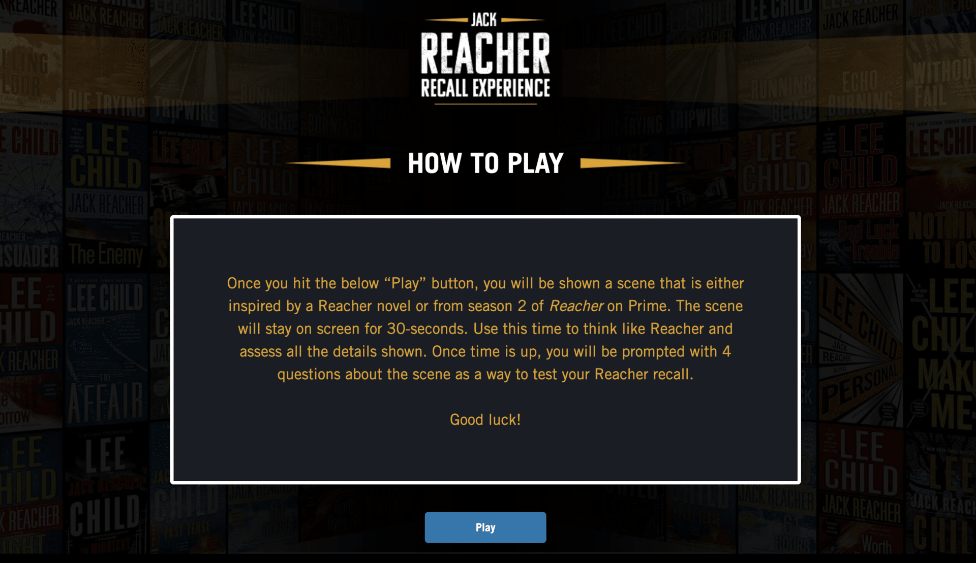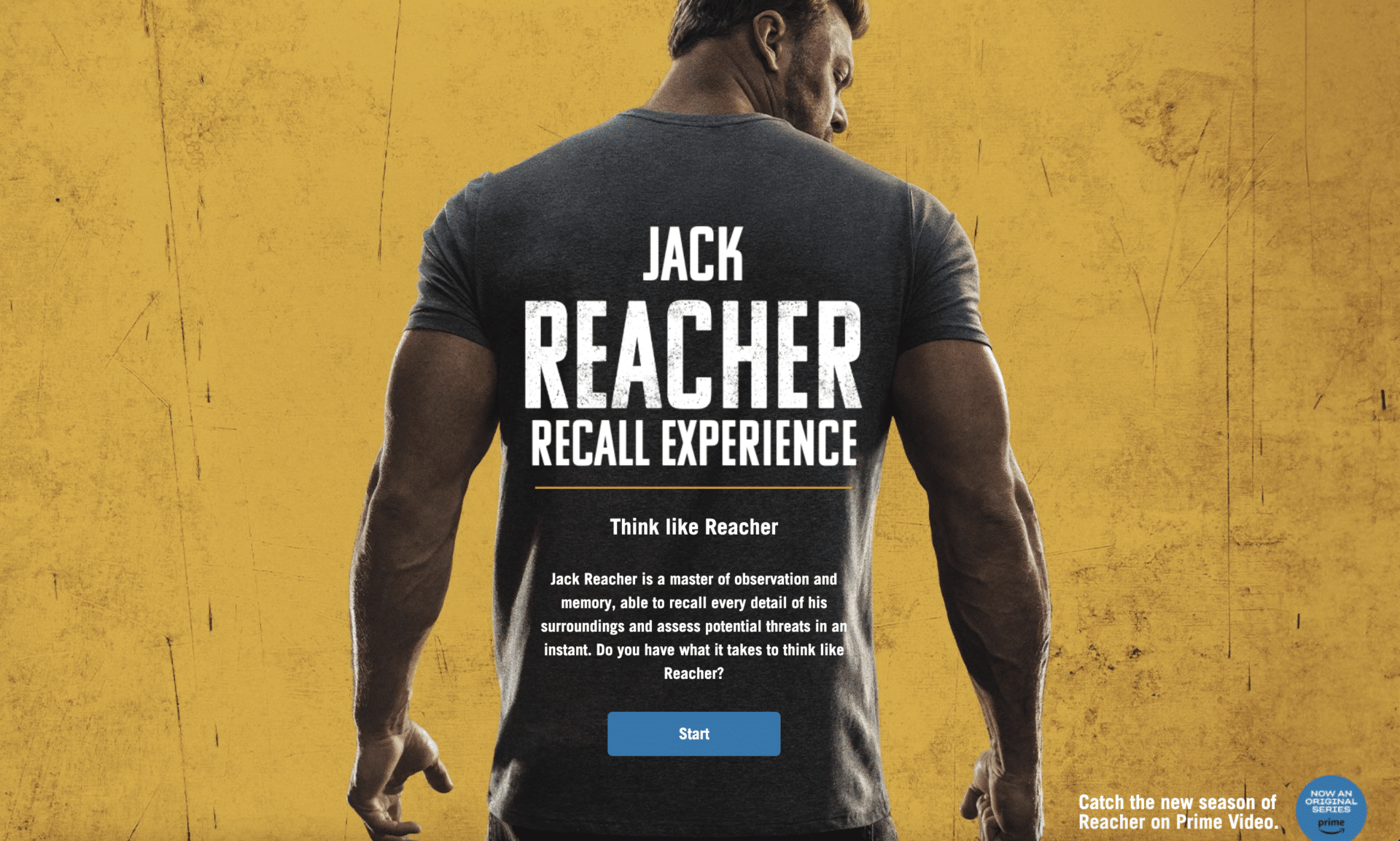 In an effort to engage consumers and drive sales, Penguin Random House in collaboration with with Amazon, launched an interactive experience enabling fans to test their observation and memory recall. Consumers strived to channel their inner Reacher by viewing photo and/or video scenes for a 30 seconds, then answering a timed series of questions to assess attention to detail.