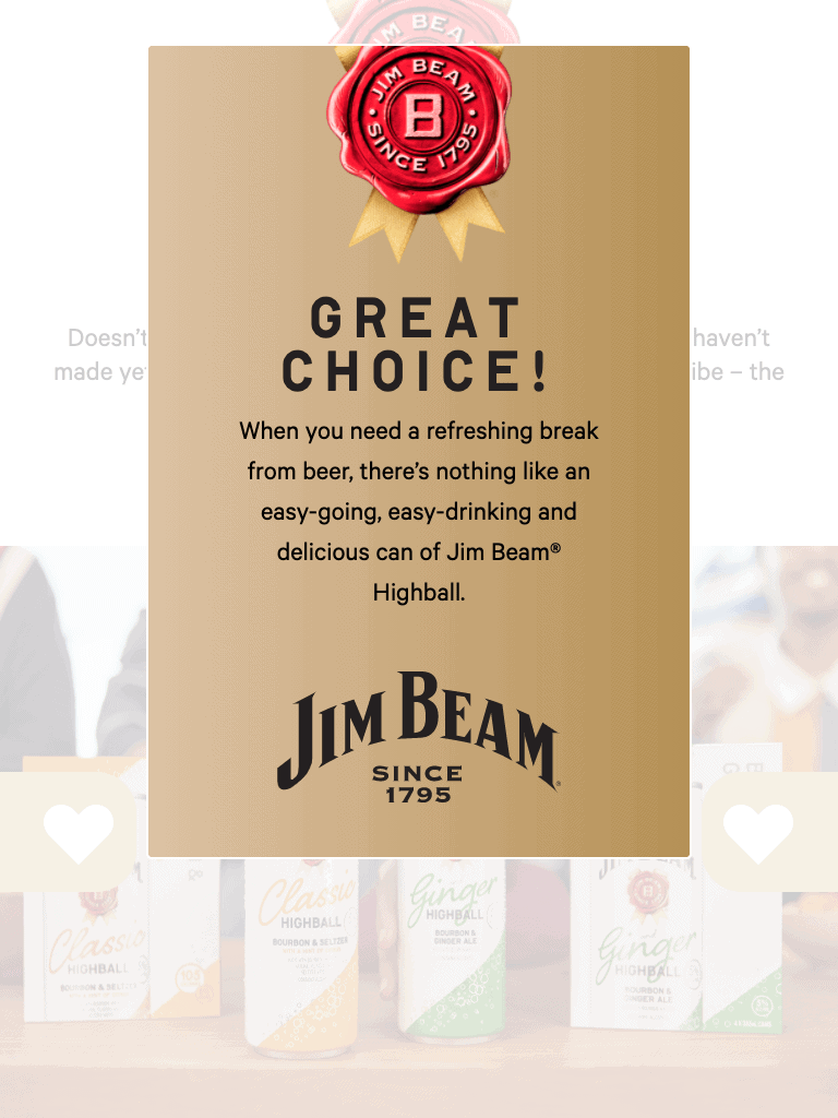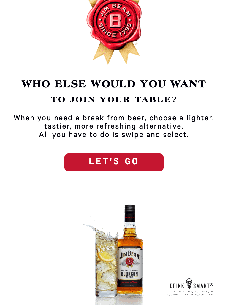 To support on-premise sampling initiatives nationally, Beam deployed a platform that enables brand ambassadors to seamlessly activate within any venue and sync data to Beam’s CRM. Consumers engaged via a swipeable tablet interface and at the conclusion a cocktail sampling recommendation was provided.