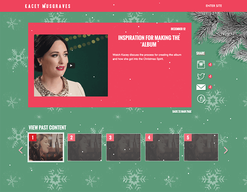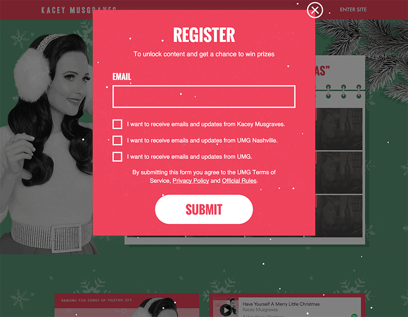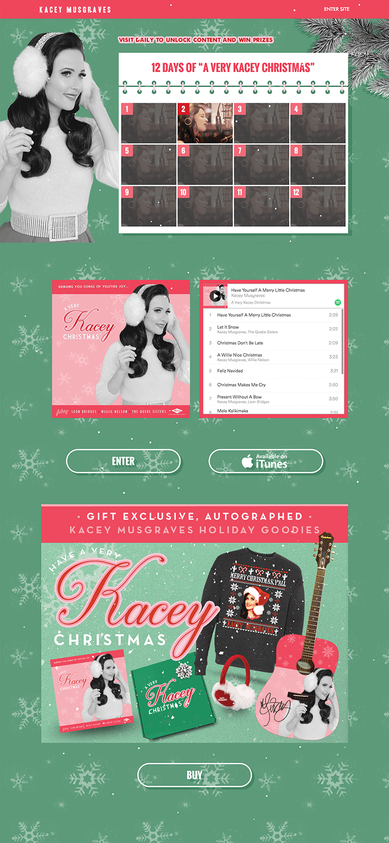 Universal Music engaged fans of Kacey Musgraves in support of her Christmas Album release through an experience in which fans were able to unlock content and earn sweepstakes entries daily over a 12 day period.