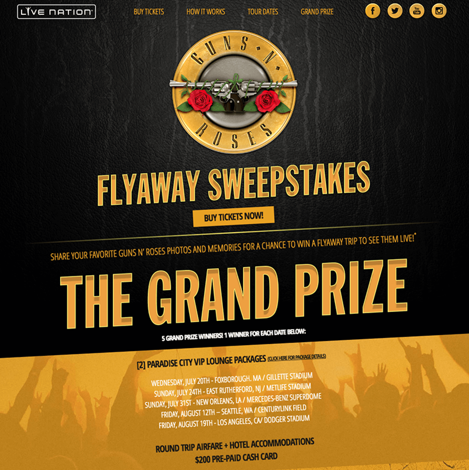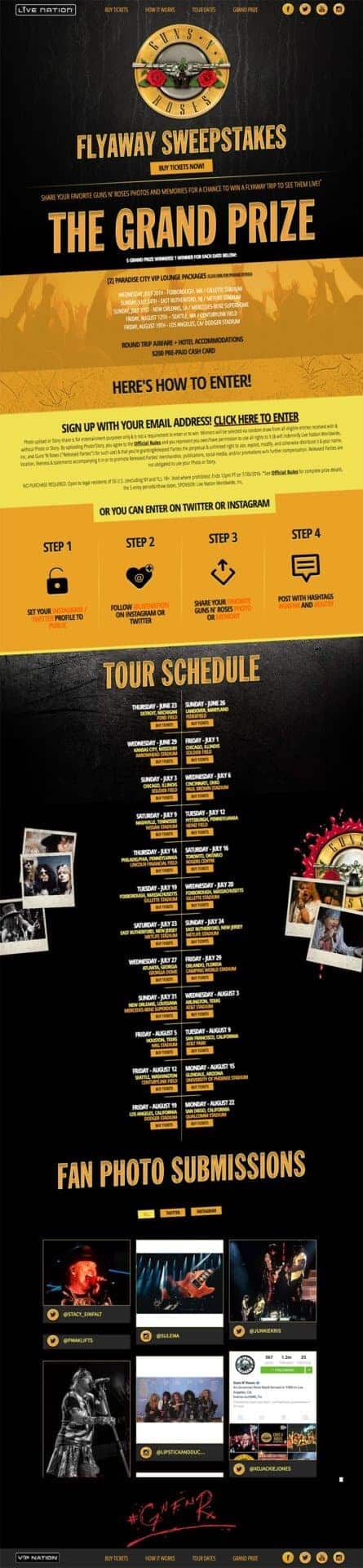 Live Nation: Guns N Roses Live Nation motivated Guns N Roses fans to share memories and photos through a sweepstakes during the band’s upcoming tour. Previous slide Next slide Click to expand