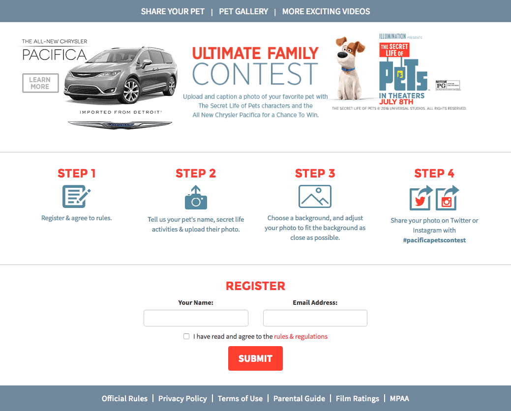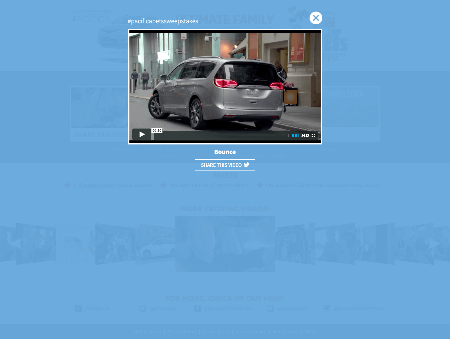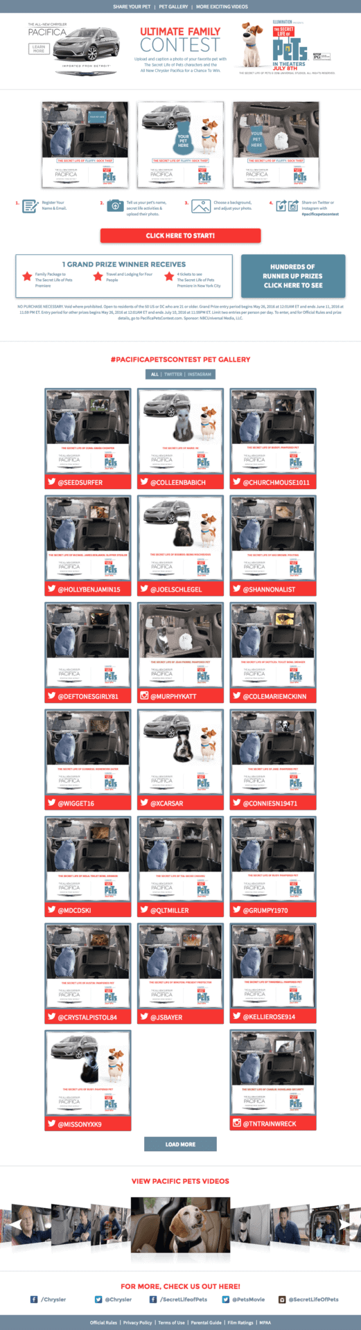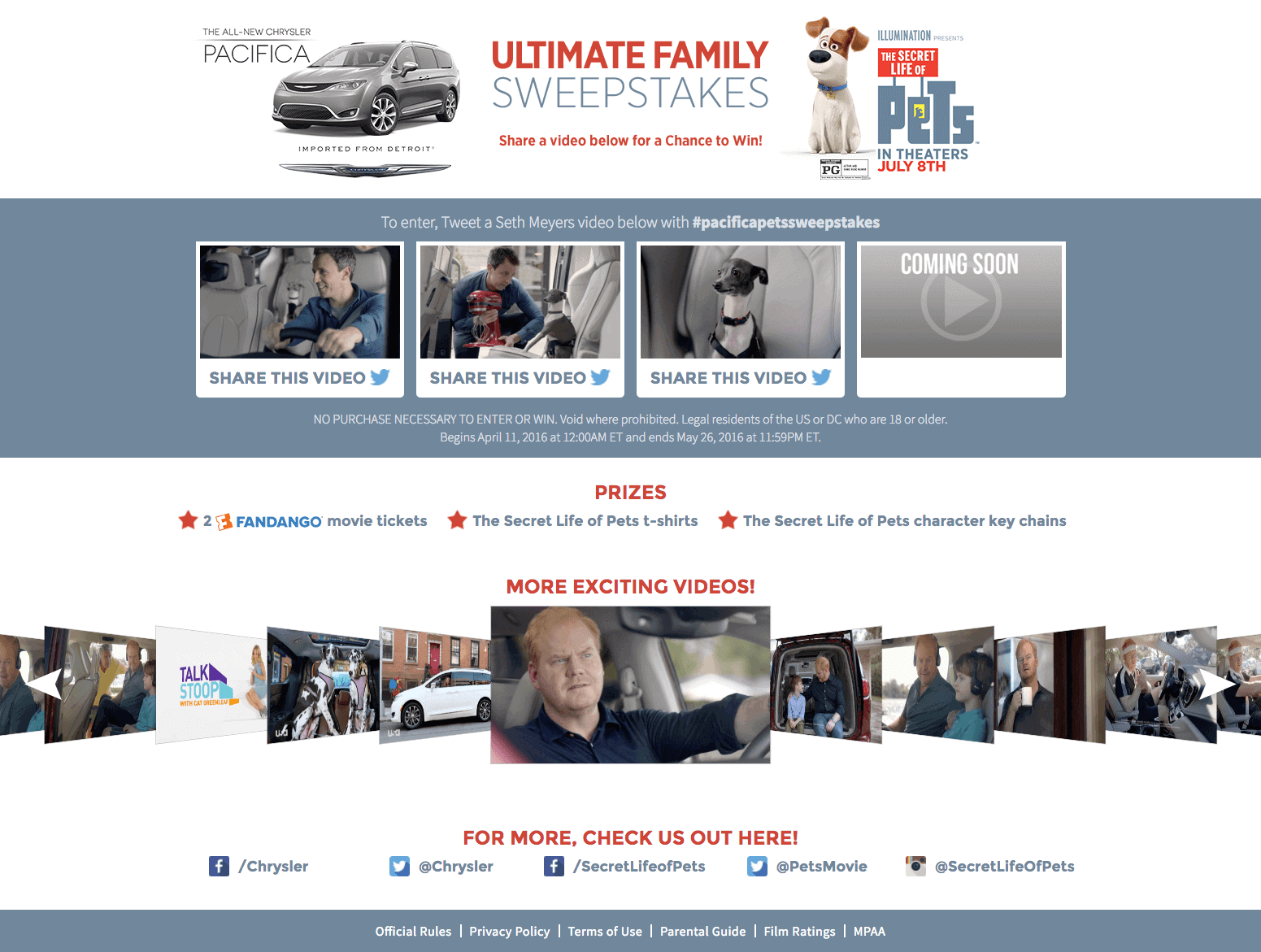 Southern Made worked in collaboration with NBC Universal and Chrysler to conceptualize, execute, and fulfill all facets of the Ultimate Family Contest. The program included both a sweepstakes and pet photo contest in support of the brand integration between the Secret Life of Pets movie launch and the release of the Chrysler Pacifica.