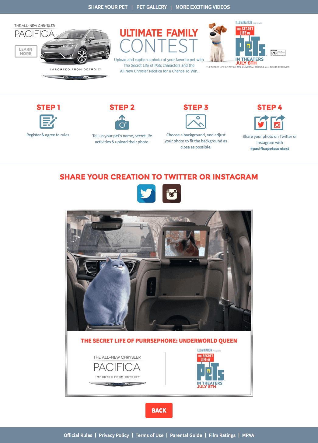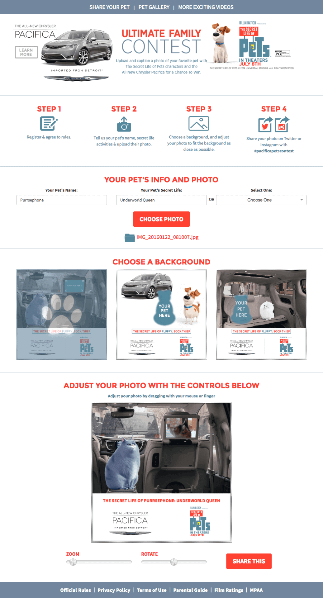 Fans would upload a picture of their pet that would be dynamically inserted into a scene from the movie. They could then submit that image to the site and share it socially to enter for their change to win VIP ticketing experiences and more.