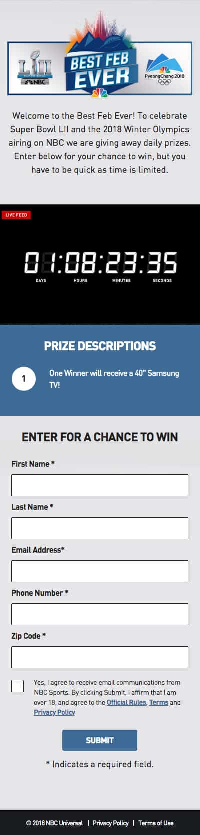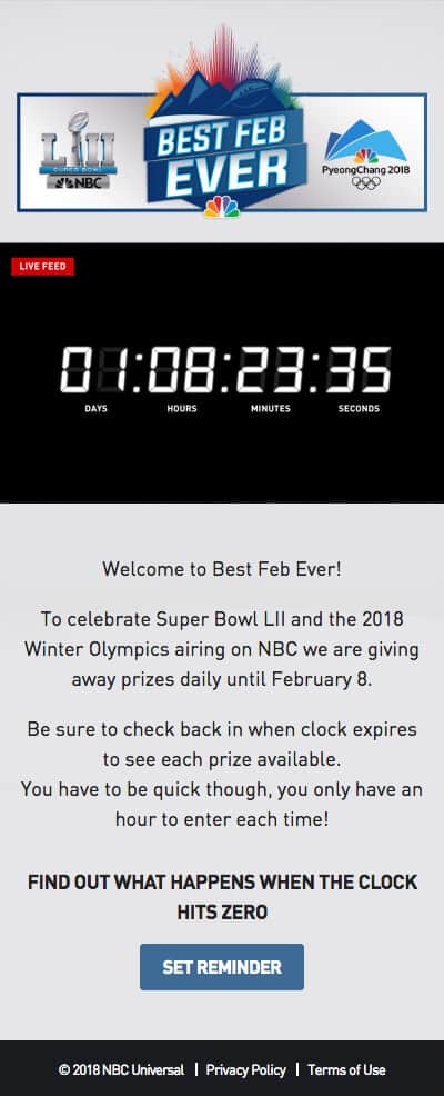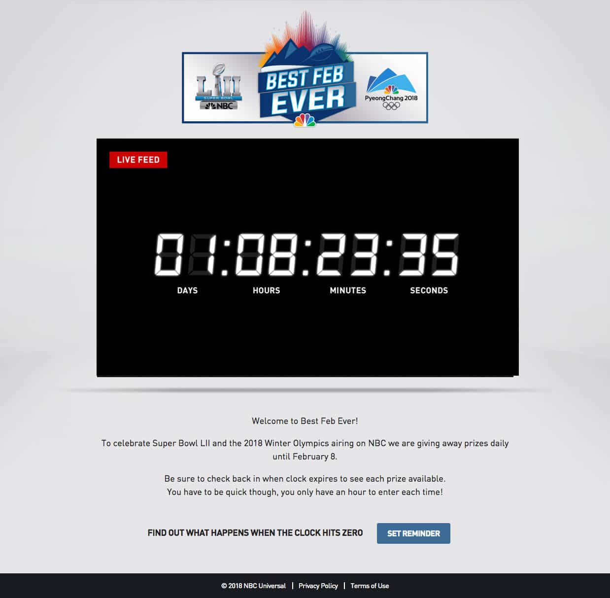 The Best Feb Ever program provided a complementary parallel digital experience to the experiential activations taking place leading up to the 2018 Olympics and Super Bowl LII airing on NBC. In select markets, a large black box would open to reveal an activation, concert or other fan experience. Integrated with the activations, the sweepstakes contained a live video feed and countdown clock displaying the black box. Several times per day over a two week period the box would open to reveal prizes and initiate a short window to enter a sweepstakes.