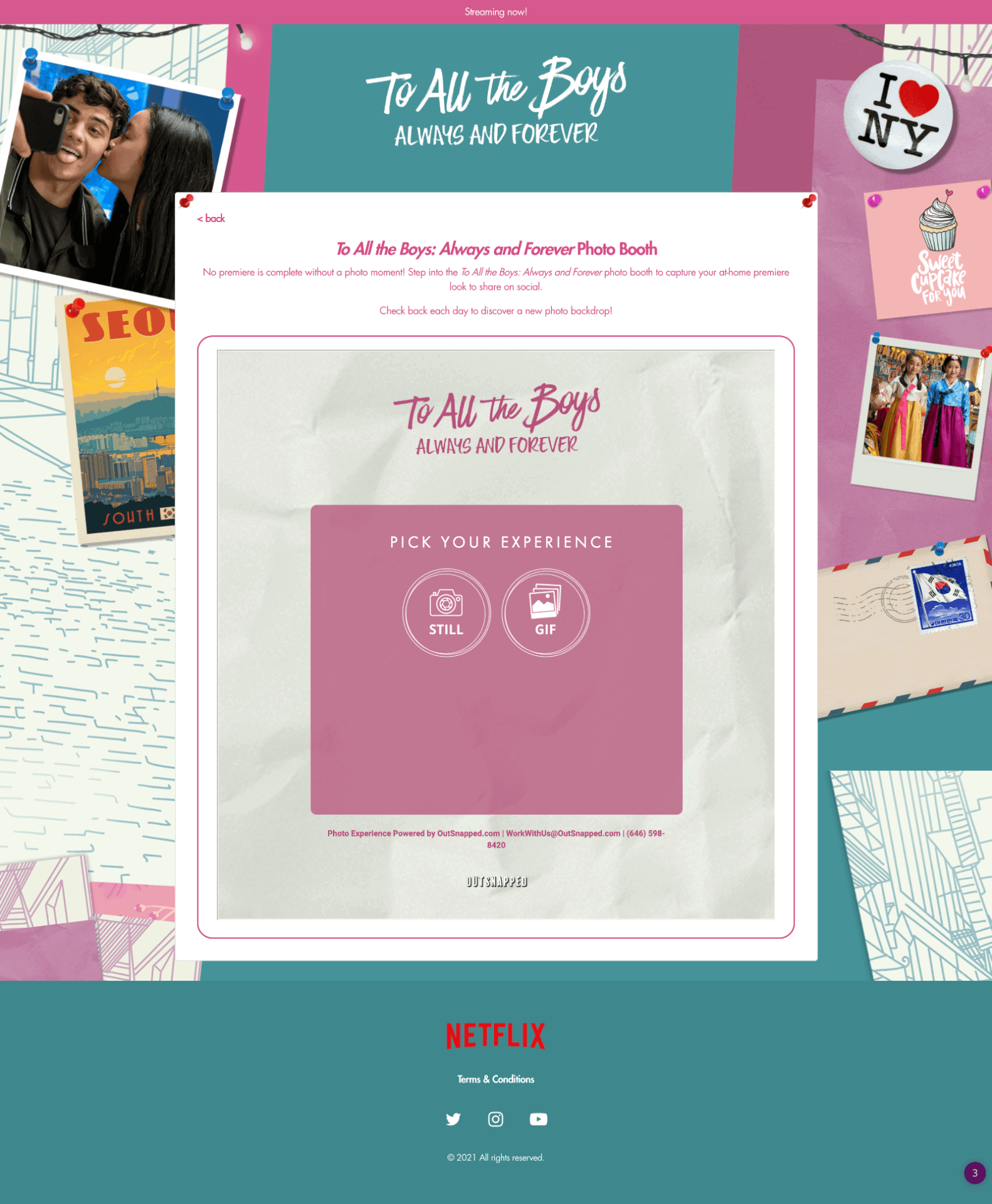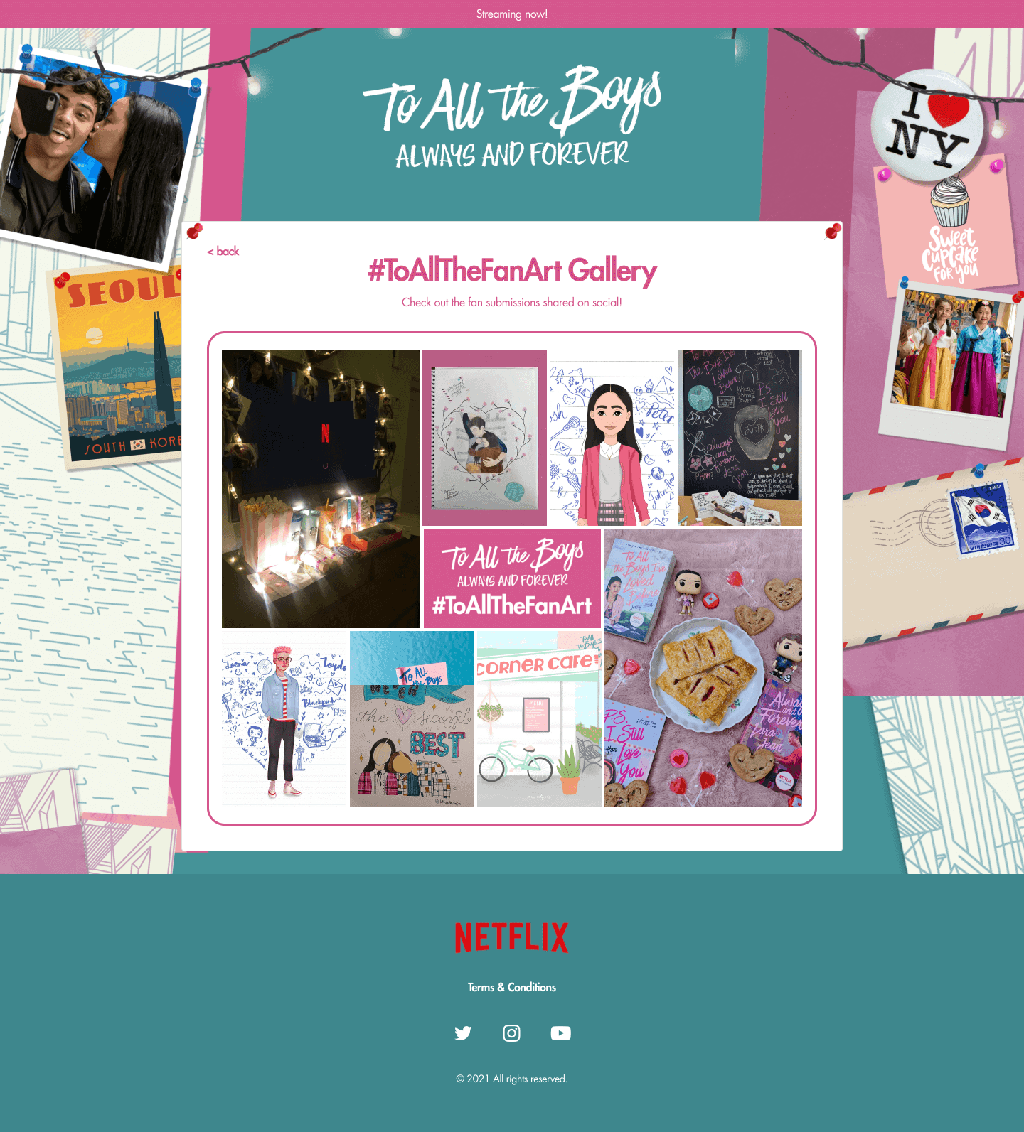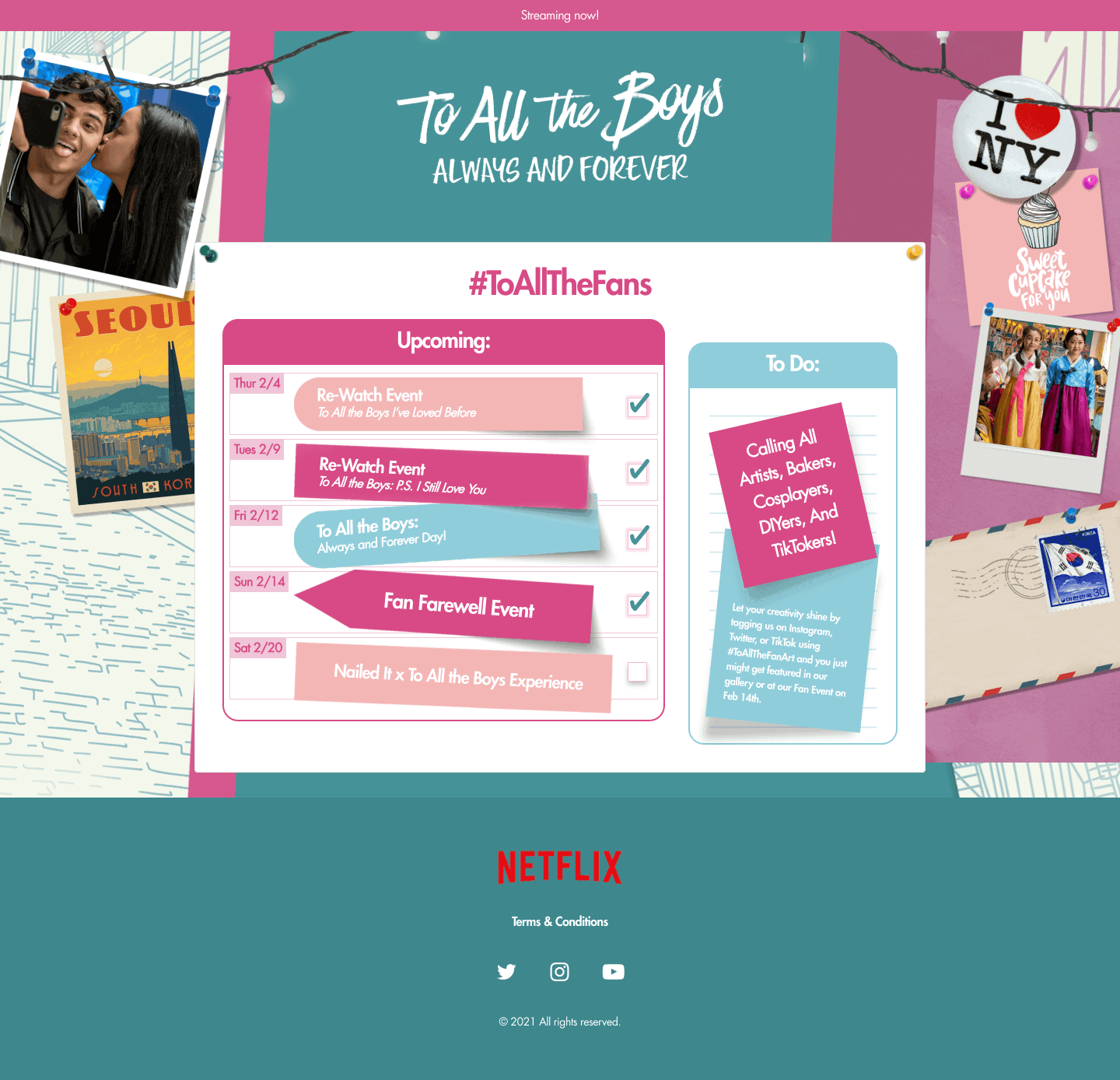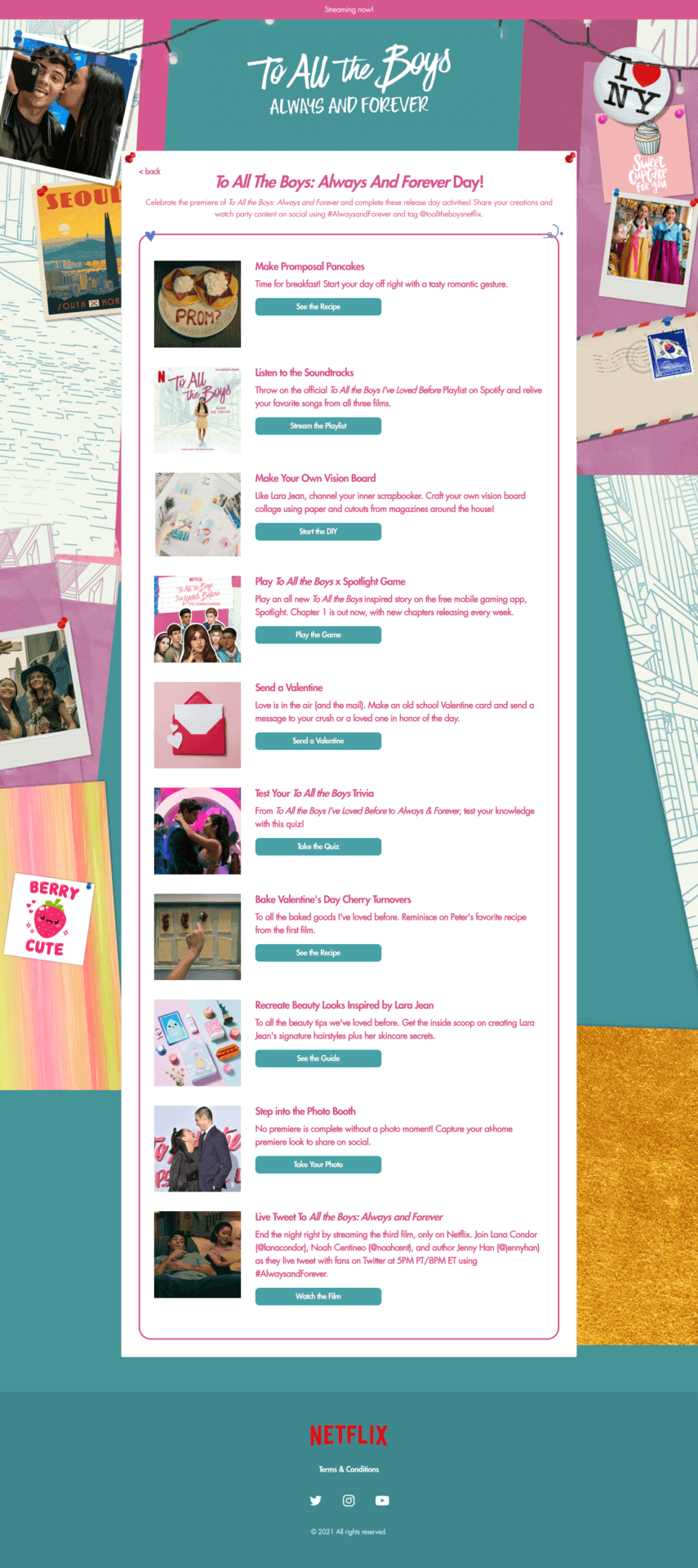 In an effort to galvanize and amplify fan excitement for the return of To All the Boys, Netflix commissioned the execution of a digital hub which offered interactive activities, content and catch up opportunities for consumers in advance of a premiere livestream of the newest movie within the franchise.