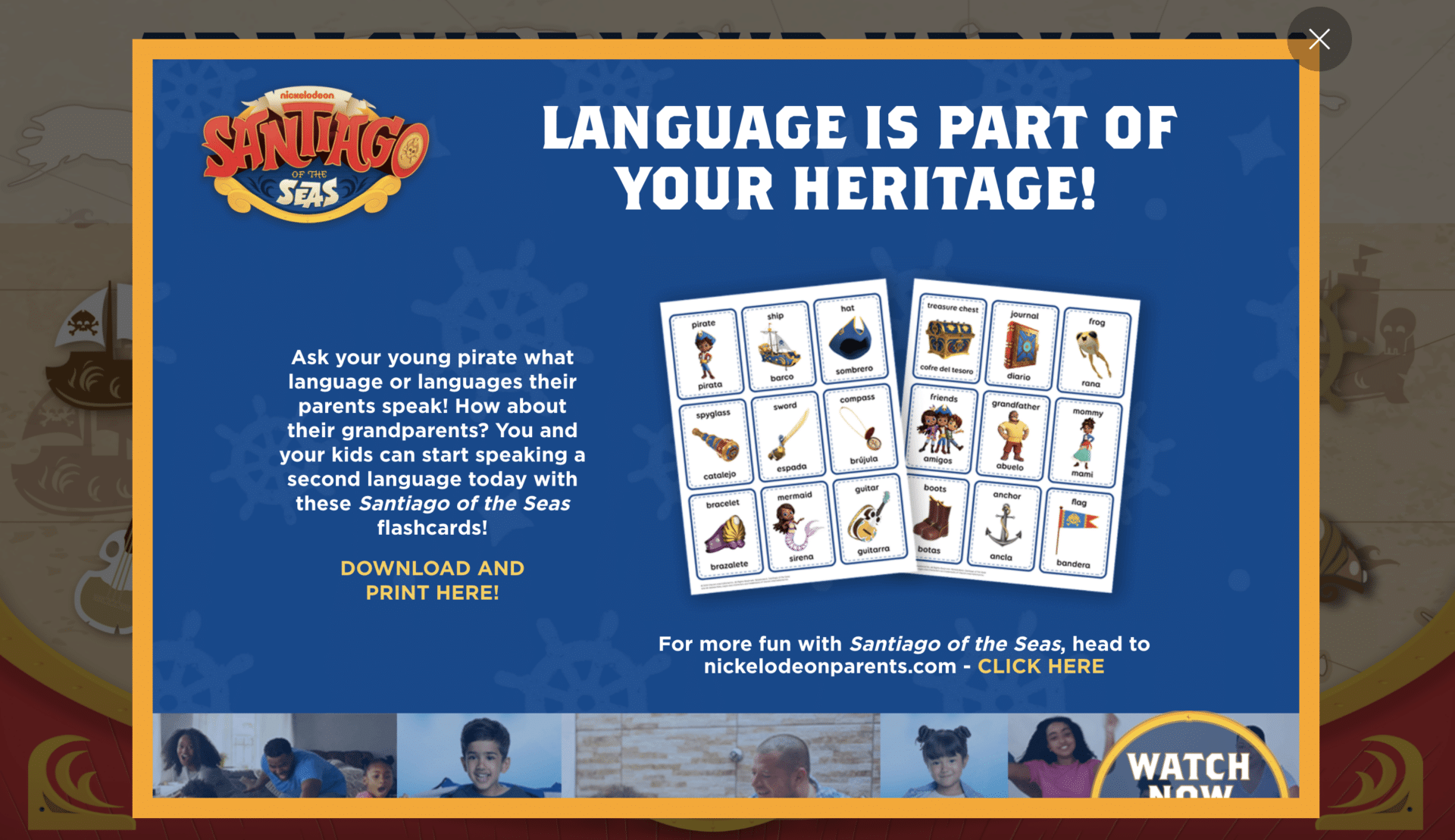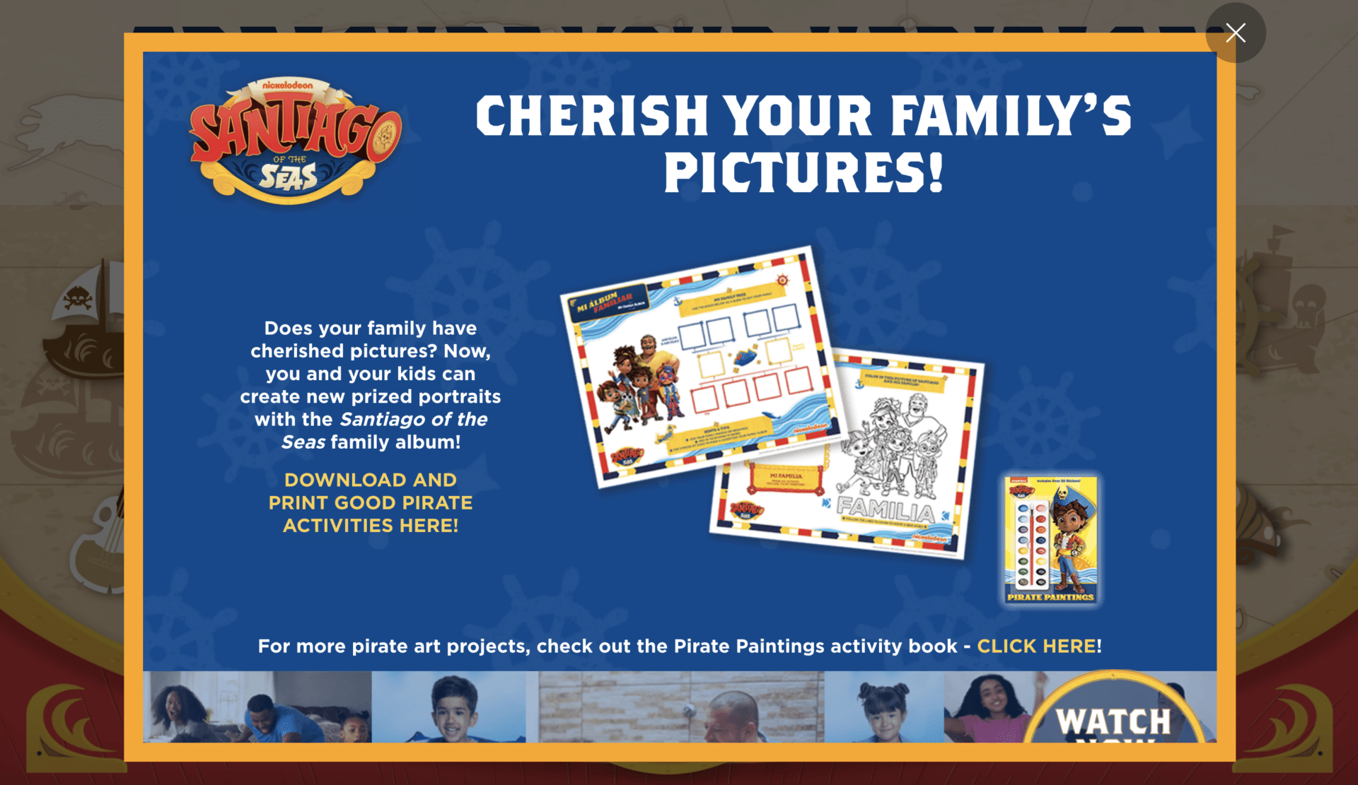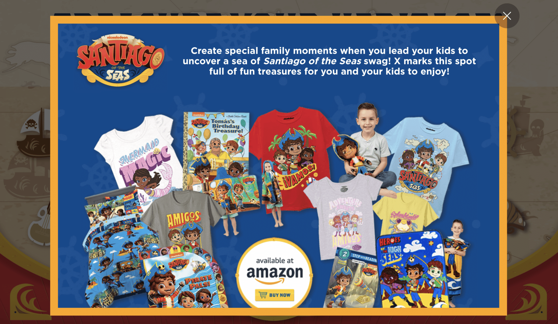 To drive tune-in, retail activations and offer audience engagement for a new series: Santiago of the Seas, Nick launched an interactive map experience where consumers could access downloadable activities, streaming promo codes and exclusive video content.