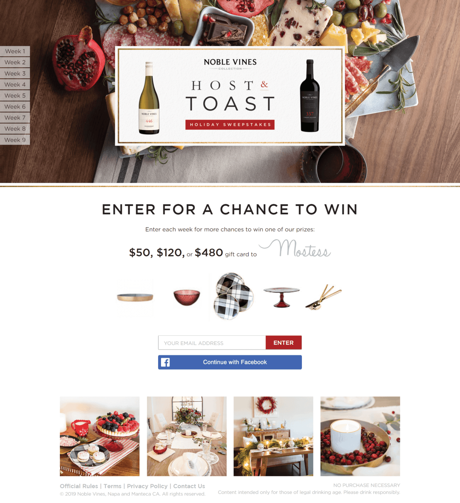 Noble Vines Host & Toast Noble Vines offered wine consumers an opportunity to win weekly prizes during the holiday season. Previous slide Next slide Click to expand