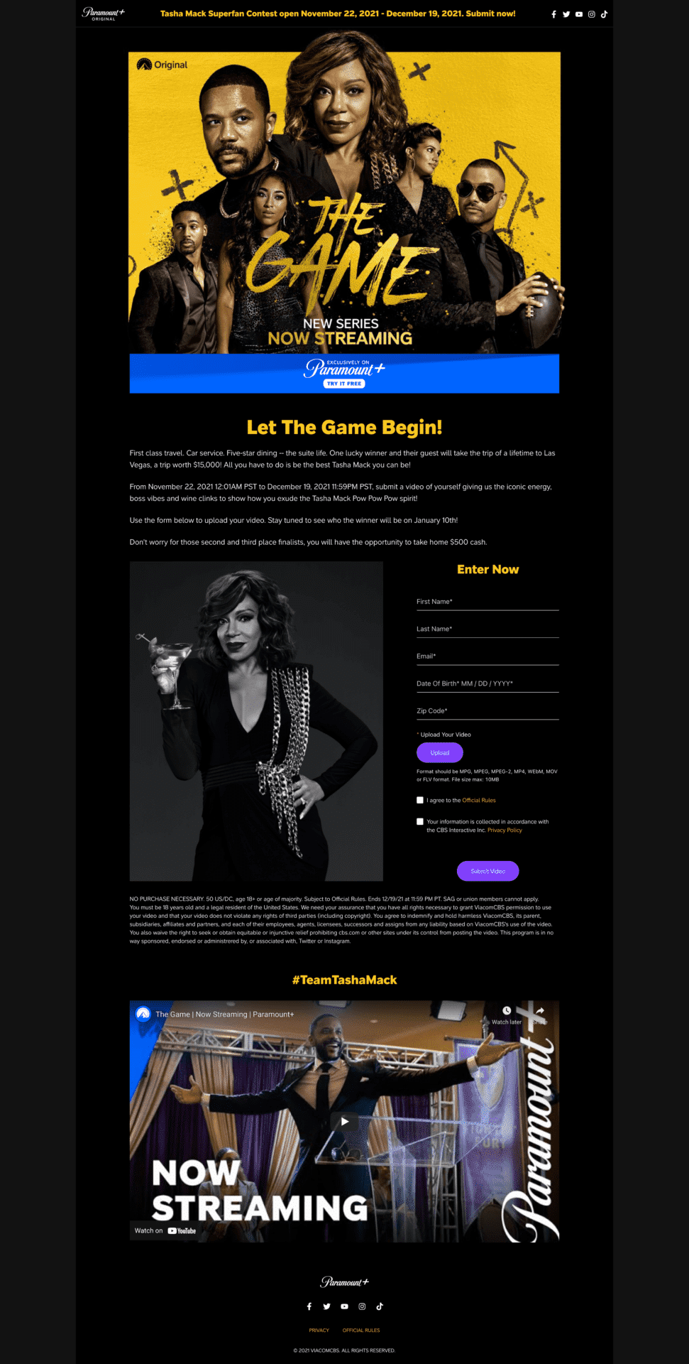 Promoting the return of the reinvented show The Game, Paramount+ deployed a digital experience offering fans an opportunity to showcase support for #TeamTashaMack by viewing the official trailer and submitting a video to win VIP Vegas experience.