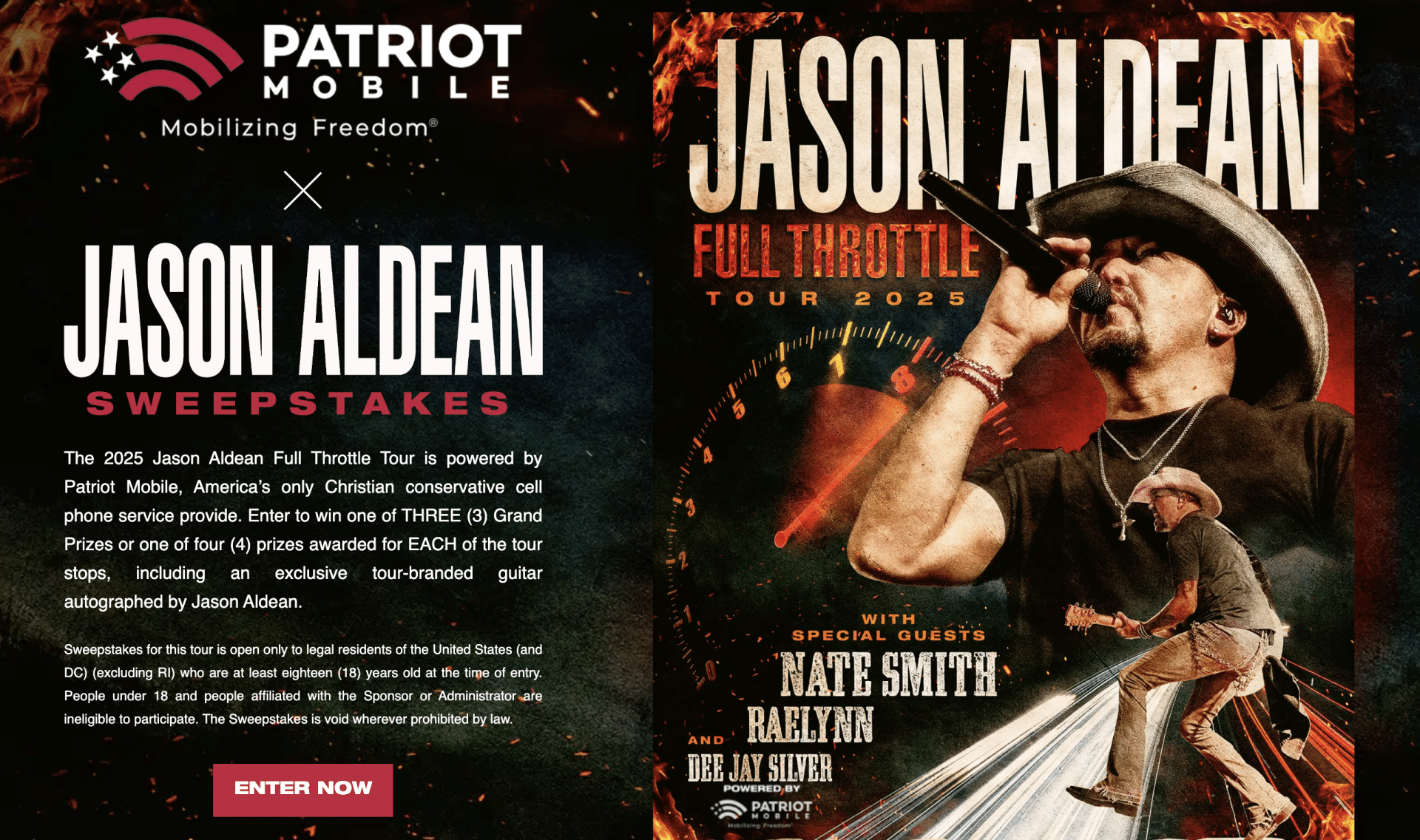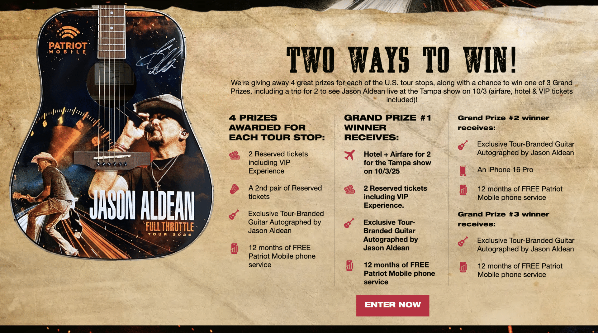 Patriot Mobile deployed a sweepstakes in conjunction with Jason Aldean’s Full Throttle tour where fans in each destination city could win tickets, VIP experiences, and signed merchandise in addition to phones and cellular service.