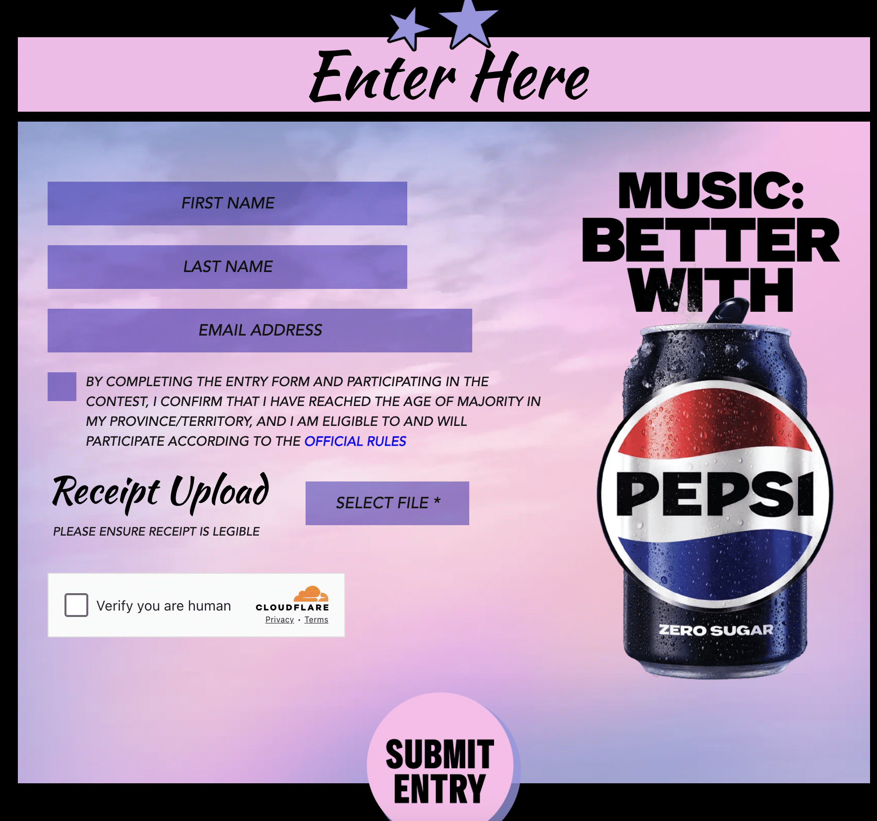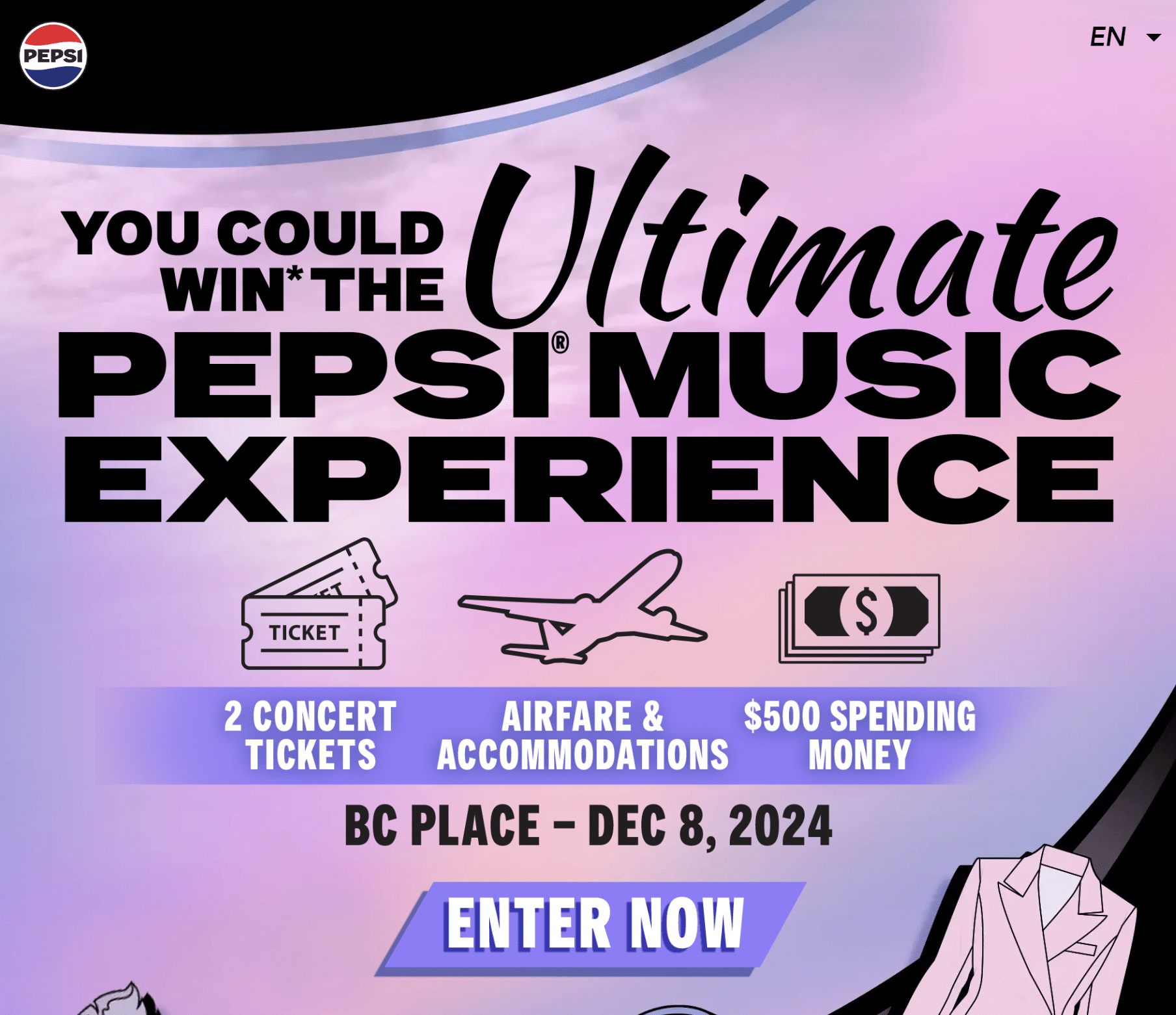 PepsiMusic.ca hosts Pepsi’s exciting music-themed sweepstakes, where fans can enter for a chance to win concert tickets and exclusive Pepsi merchandise.