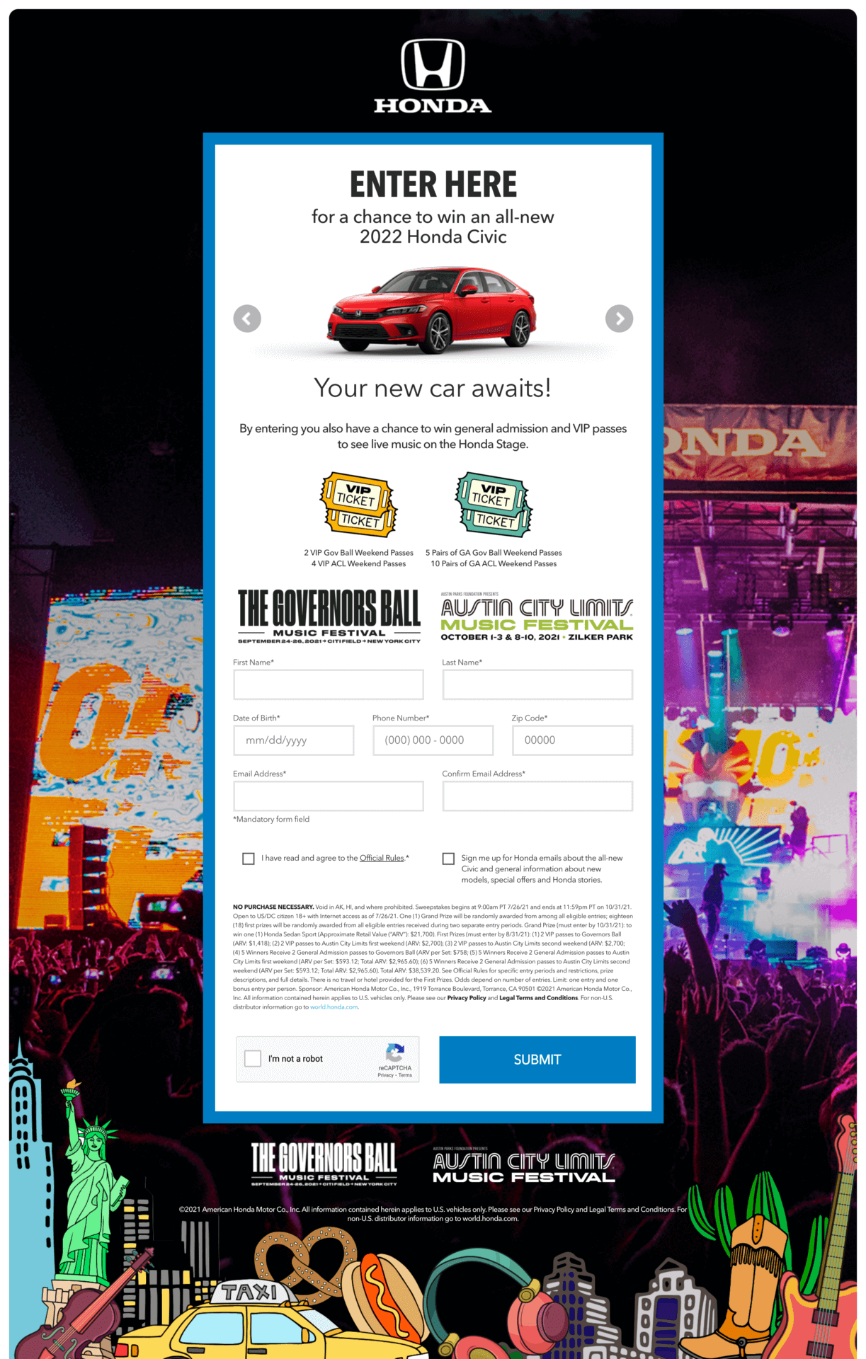 To support Honda’s consumer activation initiatives surrounding music festivals, the brand launched a national sweepstakes offering fans opportunities to win Governor’s Ball and Austin City Limits tickets as well as a new vehicle.