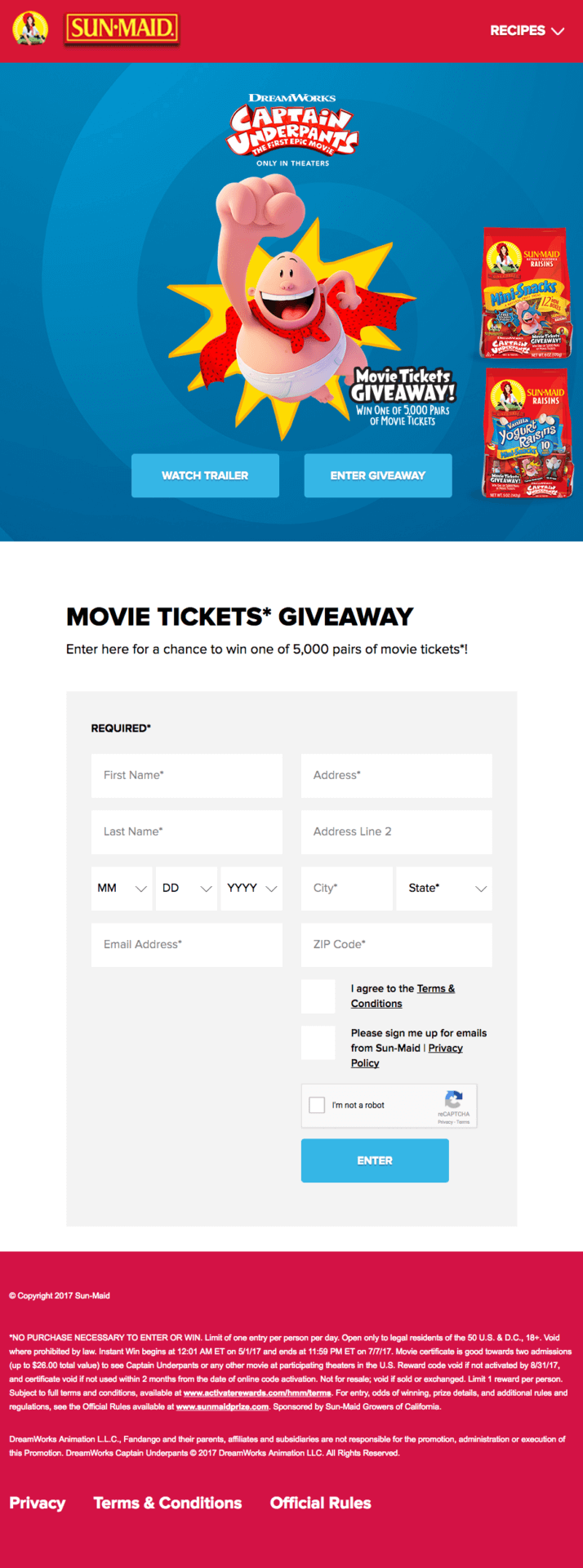 Sun Maid, in partnership with DreamWorks Animation’s movie Captain Underpants, executed a sweepstakes which offered movie tickets and access to exclusive recipe content to all participants.