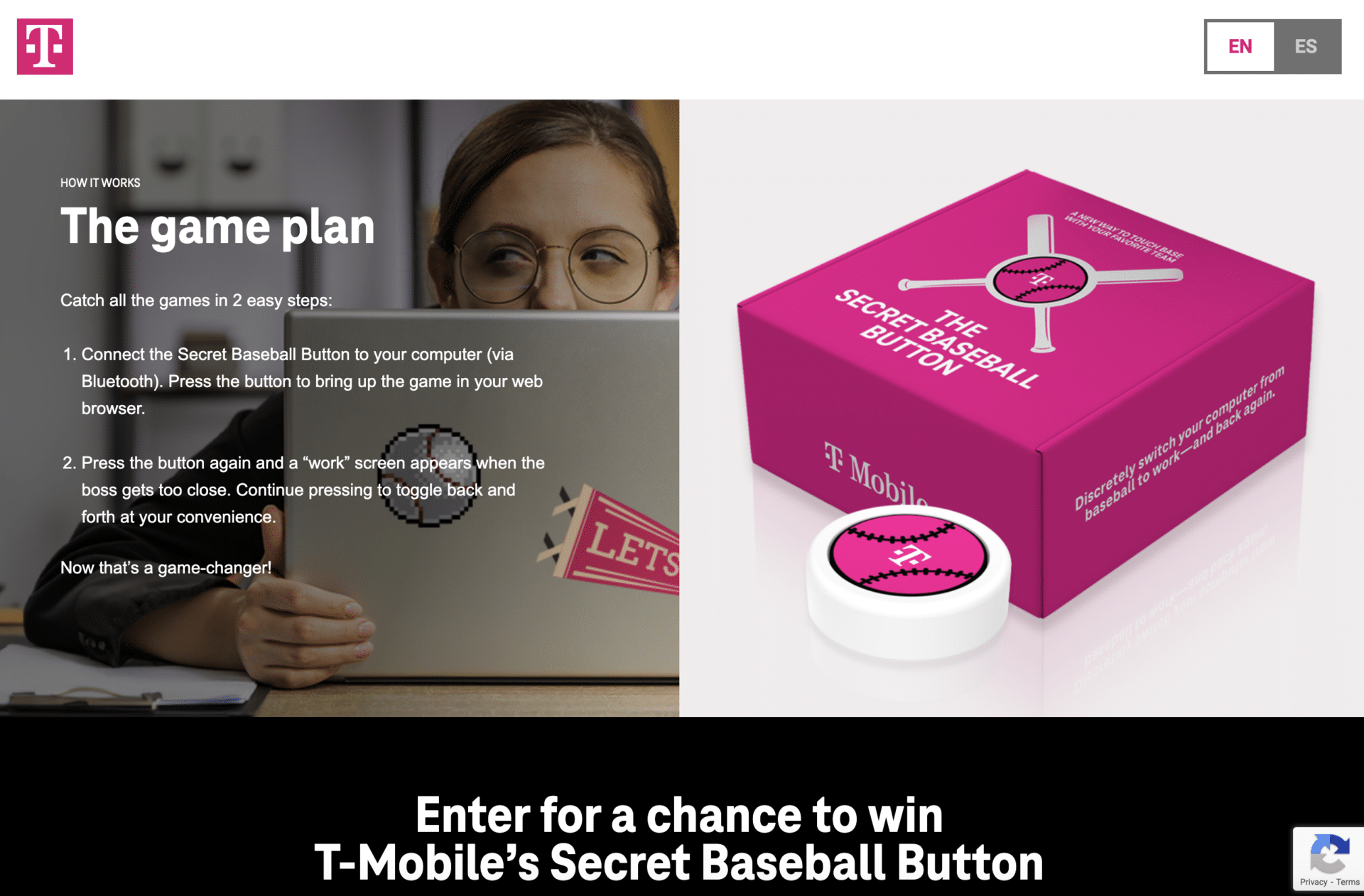 Major League Baseball & T-Mobile teamed up to deliver the ultimate @work MLB viewing experience to thousands of lucky fans. Each selected fan received a bluetooth button which synched with their device and when clicked enabled viewing of MLB games while at work. Clicking the button toggled a computer screen between live games and a simulated Zoom meeting to disguise the streaming.