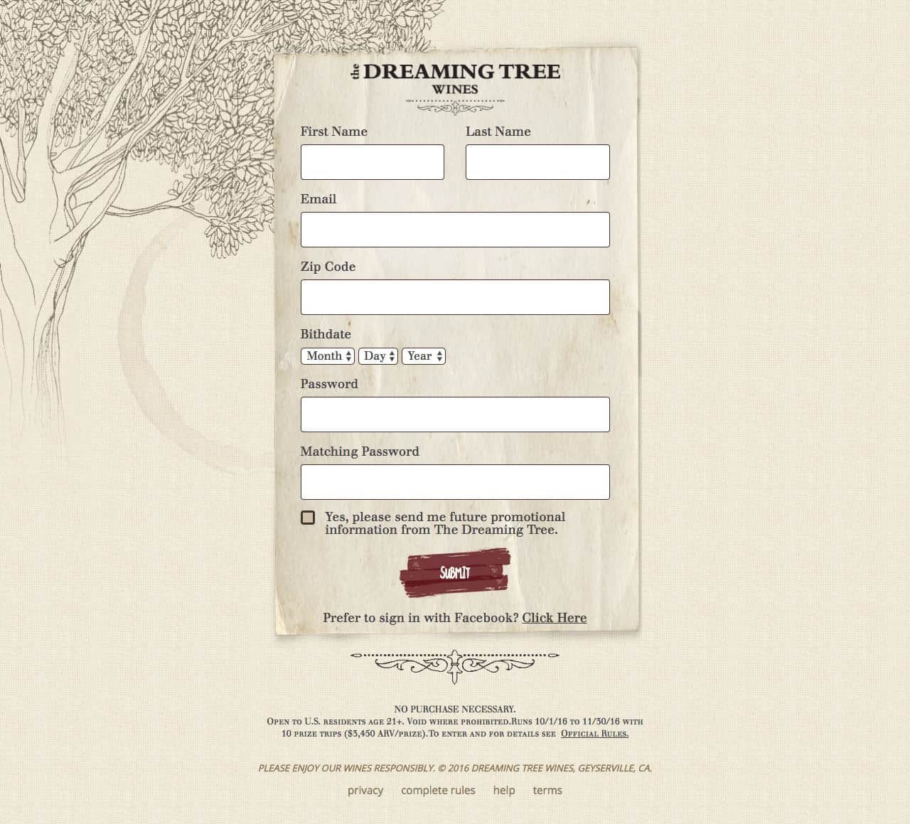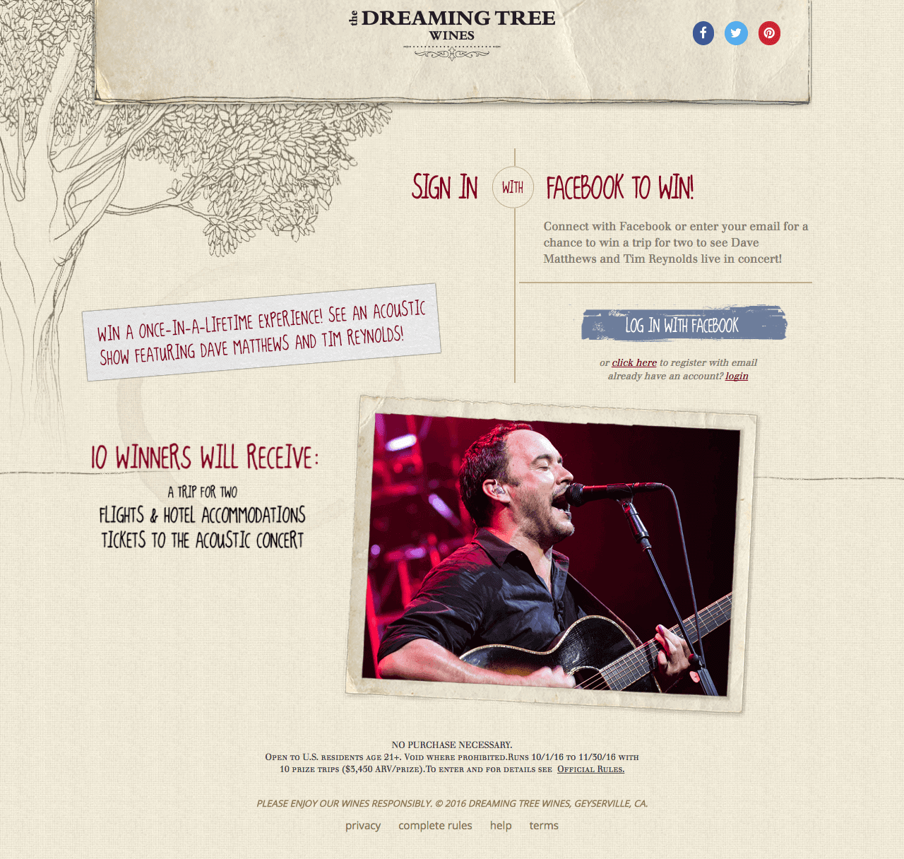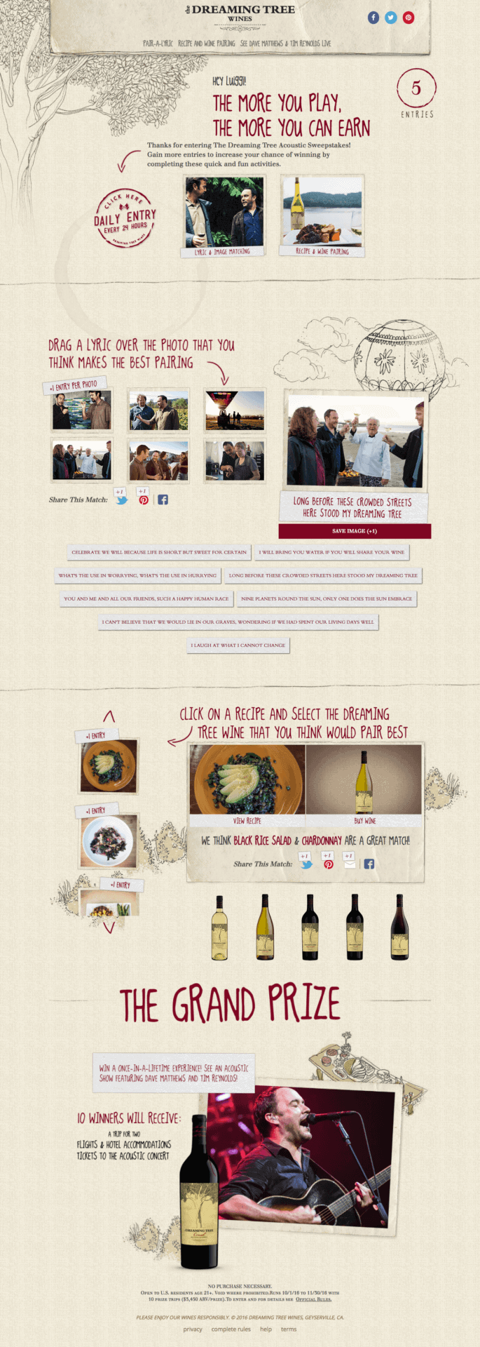 Dreaming Tree wines offered Dave Matthews fans and wine aficionados a unique opportunity to hear Dave unplugged in a private concert. Participants earned contest entries by referring friends, matching wine photos with Dave Matthews lyrics and sharing a personal picture.