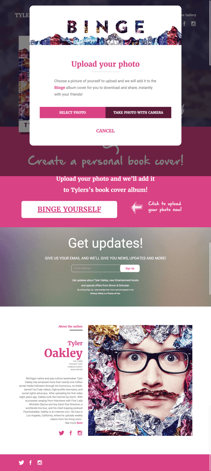 To drive awareness and sales of Tyler’s book Binge, Simon & Schuster activated Tyler’s fan base by encouraging his audience to create and share a personalized Binge book cover by inserting a personal headshot photo into the book cover artwork.